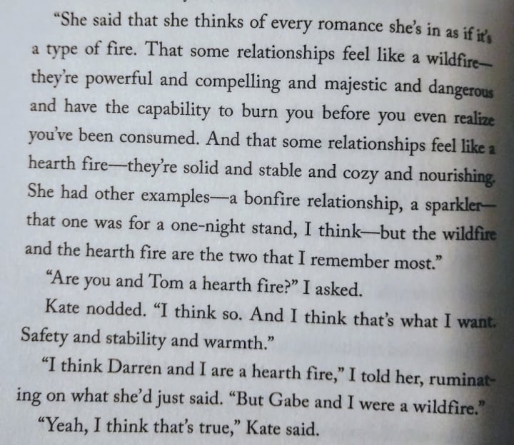 The Light We Lost makes an analogy about types of love: a solid, stable relationship is like a hearth fire; a one-night stand burns bright but briefly, like a sparkler; whirlwind relationships are all-consuming like wildfires. It’s a poetic idea, but that wasn’t why it caught my attention; it was the follow-up conversation the two characters have that kept me turning pages. After this analogy, they discuss the merits of the types of love, and then make the extremely valid point that not everyone would choose the same type of love from that list. Given the choice, we would all choose very different types of fire. It all depends on your personality -- and your partner’s -- and your goals for your future.