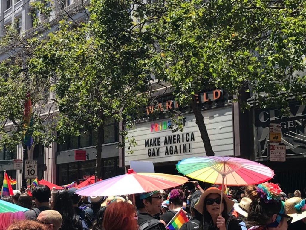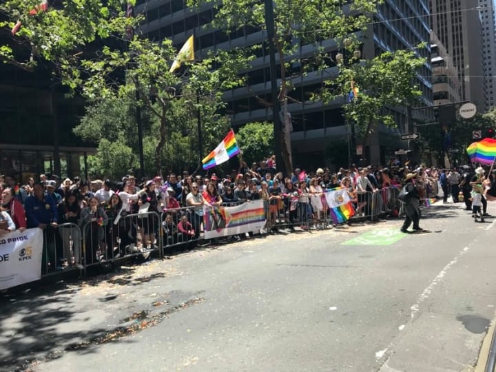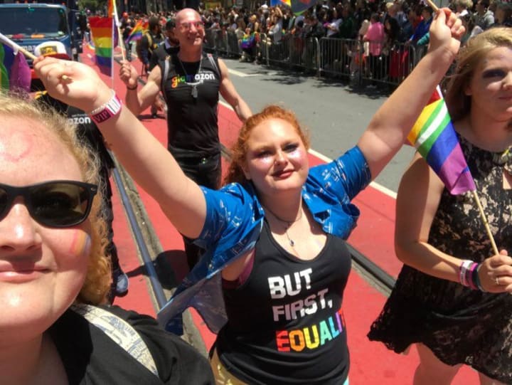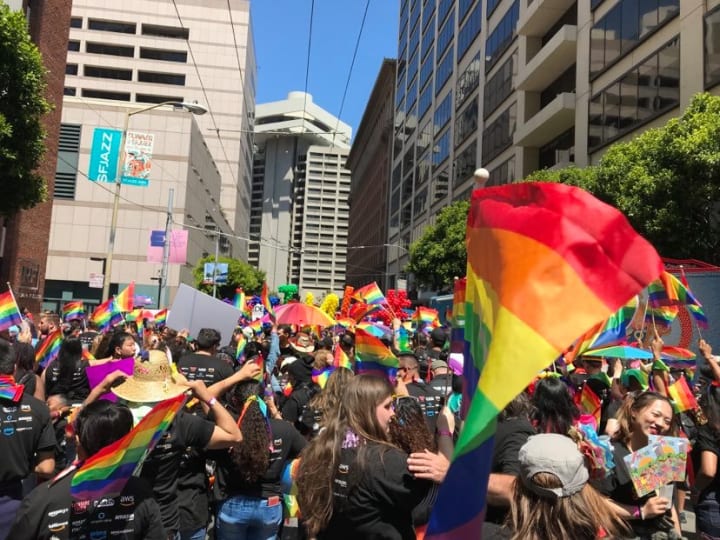 The girls and I drove up to Dublin, CA that morning and took the BART to San Francisco. They were so excited! Neither of them had really been to San Fransisco before. From there, we ubered to our designated meet up spot. Amazon was gracious enough to provide all of us with a free breakfast and a matching black t-shirt to wear in unison. My coworkers were there and handed us a free rainbow flag each, some rainbow body paint, and glitter sunscreen. As we got fully decked out in bright colors, I remember soaking in the moment. There were bubbles in the air, rainbow colors as far as the eye can see, and "Bad Guy" by Billie Eilish was bumping through the speakers. I started to feel something I hadn't felt in a long time: happiness.