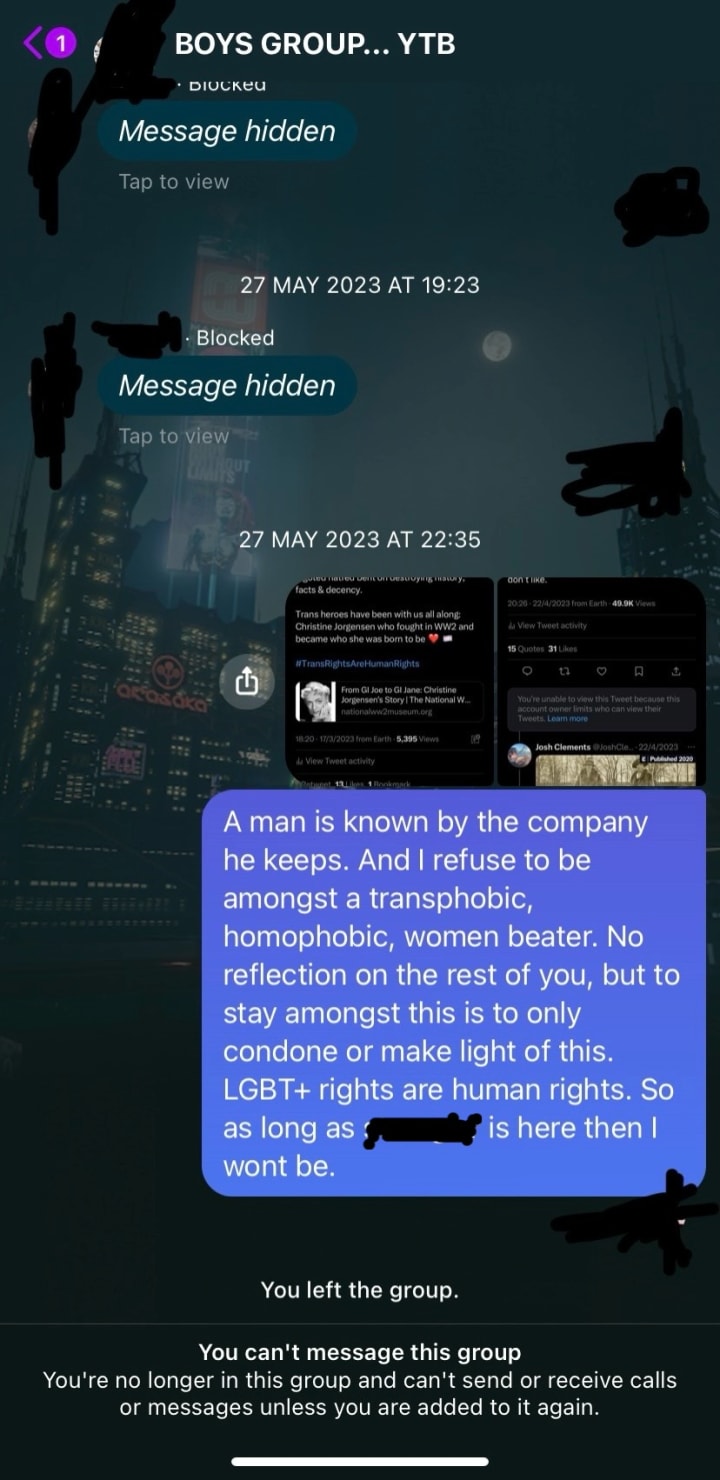 As an example, I recently met a friend for a drink, she and her new girlfriend, and we got to discussing my friend's living arrangement — she has a flatmate, a man, who she had met via a flat sharing website, my friend explained to us (and her girlfriend) that she was living with 'a nice guy' (I know, aren't they all...), but he was a Trump and Tate listener/supporter; my friend gave us a jolt when she repeated the much mistaken claim that "men are being blamed for everything, these days".
