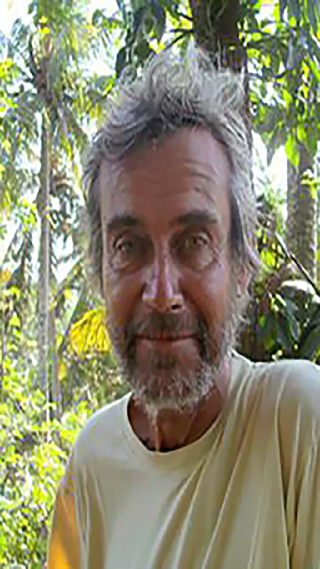 Past the kneecaps, his right leg appeared mangled. A pair of worn-out sandals covered his black toes. "Transcend it," he mumbled from within a buzzing ball of flies. "Inhale; be one with nature." He wandered up to a coconut tree and wrapped his arms around it. The stubble of his chin rubbed against the trunk.