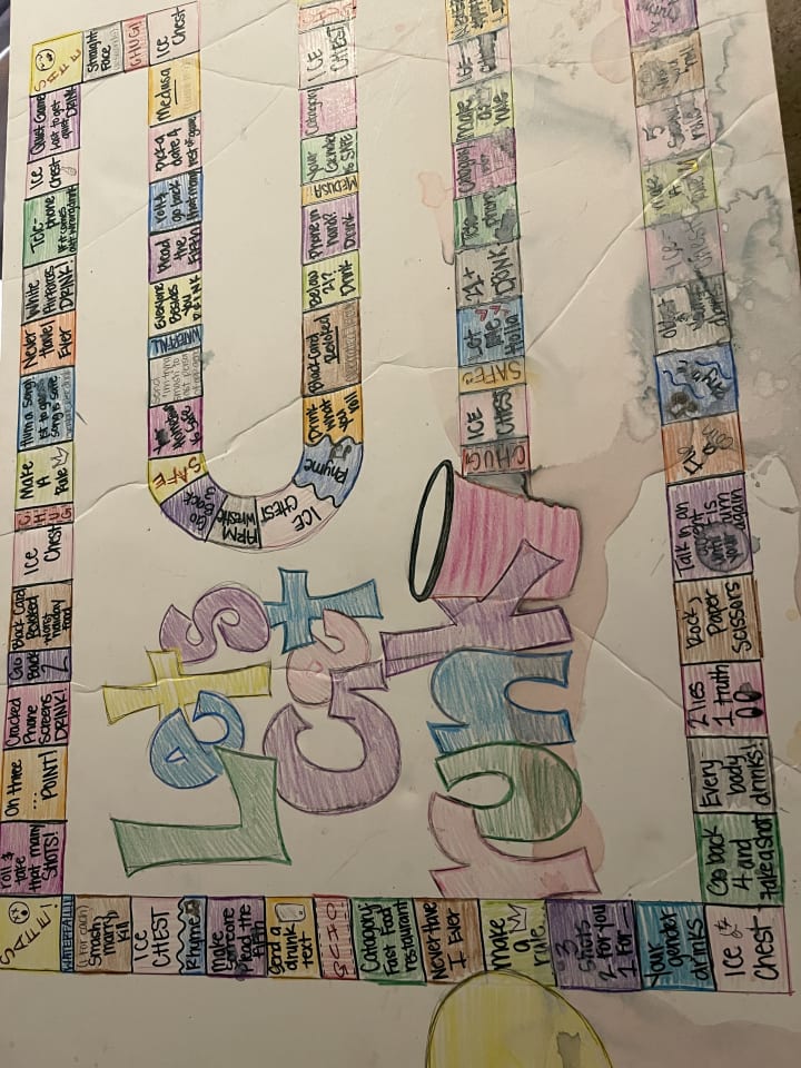 Now as for games, I actually make all of my own. This is a little bit of a pre-investment if you want to take it to the level that I did. I bought a poster, markers, a sharpie and index cards. With all of that I mad my own game board for adults who were drinking. Each spot that you land on has a different thing that you have to do. Ever since I started pulling this board game out, my game nights have been way more fun.