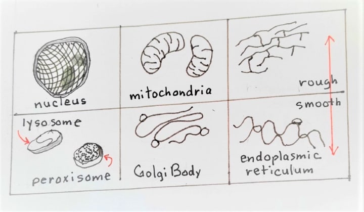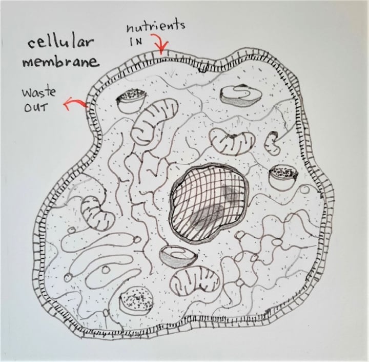 Start with a simple outline of a irregular cell shape. Double the line to make a two layers shape. As each symbol is added, read about what it does and rejoice at the masterpiece of evolution we really are. As a final touch, you can connect all the lines and pepper with dots to show its protoplasmic quality.