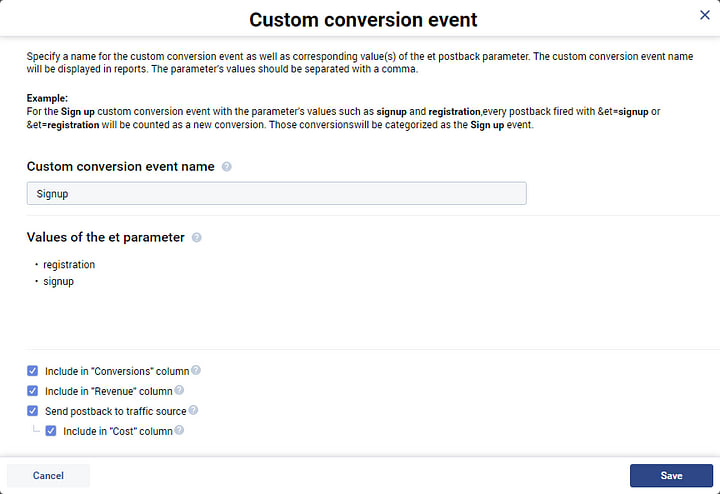 6. Provide accepted values for the et parameter added to the postback URL in Voluum. You need to take those values from your affiliate networks based on parameters the affiliate networks enable you to use in the postback URL.