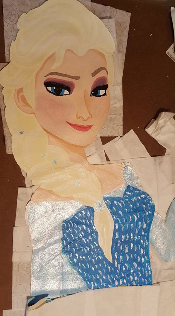 Miraculously, Elsa stayed intact. Staci brought the mural home and cleaned her up a bit, and then went looking for a canvas big enough to hold the figure.