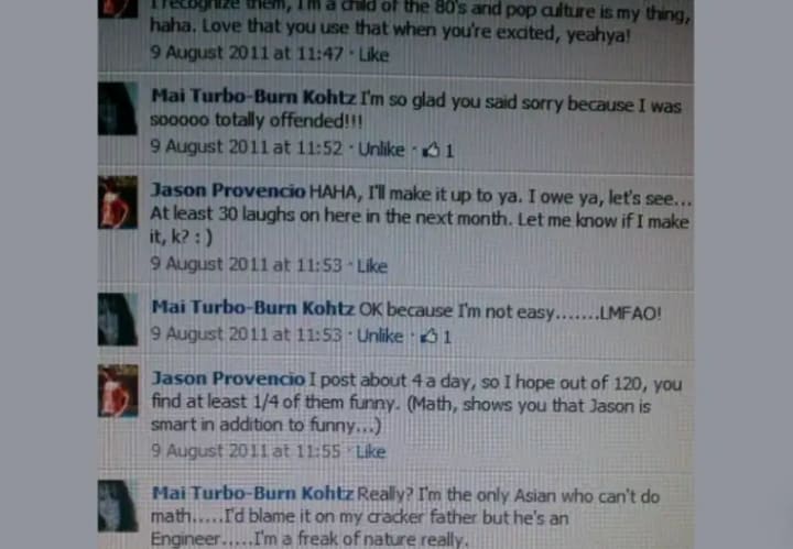 Mai and I met on Facebook. I remember getting a friend request on August 9th, 2011. I first had to check her profile before I accepted it to be sure it was a legit profile. She was beautiful, so I figured it was a fake spammer account.