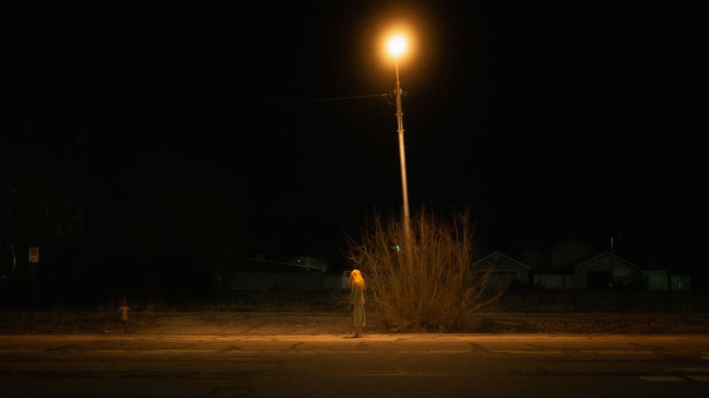 The streetlamp glows brighter, illuminating something at my feet. I look down and see a line of thread I didn’t notice before. It starts at my feet and winds on down the road. There’s no end in sight.