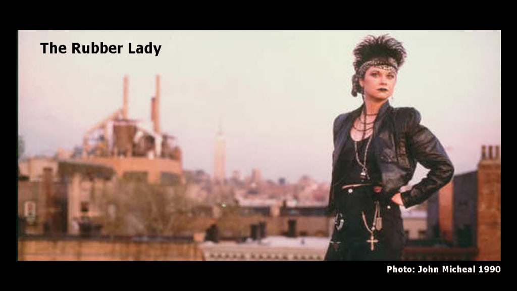 I've been many different people throughout my life, but no other personality is more memorable then "The Rubber Lady". From 1985 to 1994, I embarked on a journey. There are many stories, way more then I can begin to tell in just this one page. So, I've been asking myself, how the heck do I even explain The Rubber Lady? Well, it helps that I have a lot of photographs. The Rubber Lady had a way of attracting photographers, from students to professionals. All photos are my property and include photo credits.