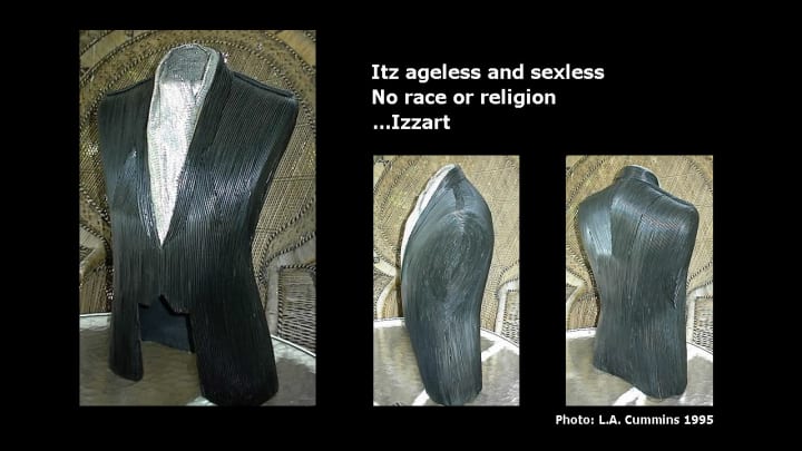 One day, I walked into my favorite thrift store and there it was! A male mannequin torso. I couldn't resist. I had to buy it. My first thought, I'm going to cover it in rubber. That is exactly what I did. Although I covered the piece in NJ in 1991, Izzart didn't really take on itz full personality until after I returned to Dayton, later that year. I still have Izzart. After 30 years, Itz needs a little TLC. Some clean up and repair. I'll be updating on Itz in a later story.