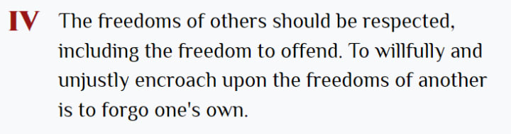 Freedom to offend, huh? Great. It seems we've found our first violation of the 7 Tenets. Here you go: