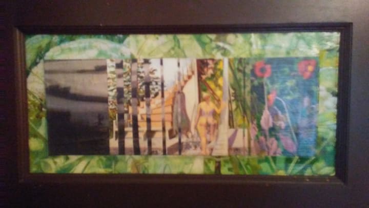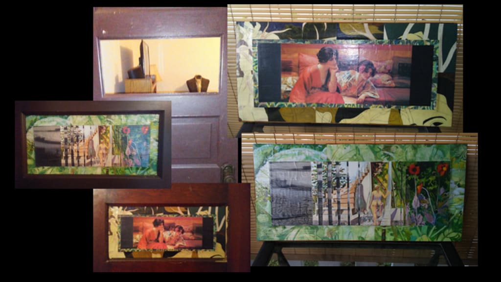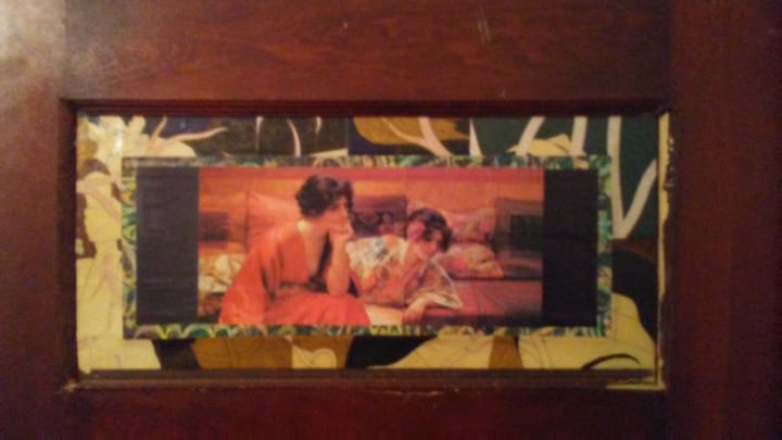 The joy of seeing the panel come together was inspiring. I loved going through the catalogs and picking out pictures to cut into. The beveled edges of the panel were perfect for framing. Although Mod Podge is a glue, it's made to cover images, schmeld them down and create a protective layer. The matte finish has a way of adding a patina to the piece. The door panel was the perfect way to dig back into "The Podge". It was a great practice run and now my bedroom has a lovely piece of art covering that offensive hole. That brings me great joy and happiness, not to mention privacy.