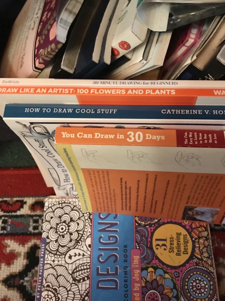 I’ve added to my collection but I started with one book. It’s called “You Can Draw in 30 Days” by Mark Kistler. I’m almost to lesson ten and I’m astonished. I can draw. I’ve learned how to draw spheres, cubes, boxes, roses, cylinders, houses and much more. I loved each lesson because it was step by step and challenged me to find my own form of expression upon learning the fundamentals.