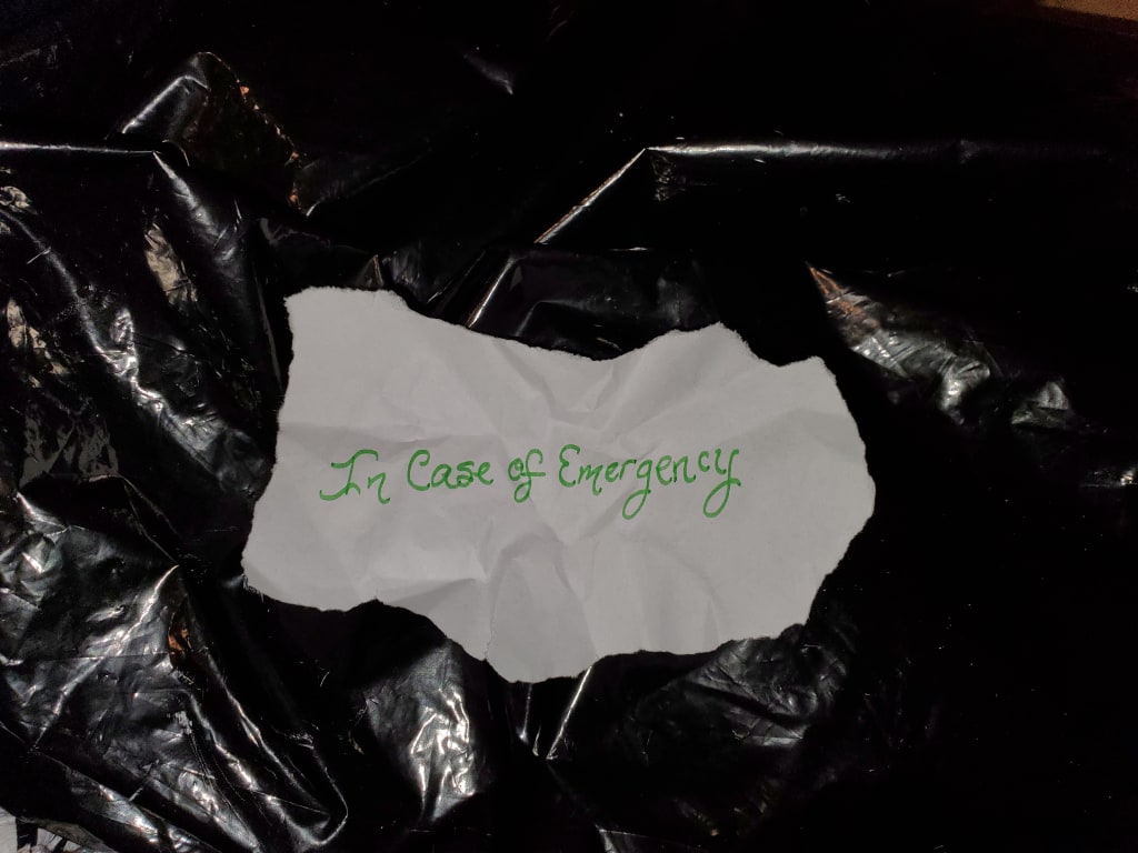That’s it! When he was putting his dirty clothes in his own grocery bag, he had set the bag down on the shelf of the closet so he could hang the hangers back that he had used for his wet clothes. At that precise moment his phone rang (his boss, reminding him of a point for his meeting...a point he had already pointed out), and that’s when he absentmindedly grabbed his toiletries bag off the counter, and the dirty clothes bag off the closet shelf. This black bag must have been up there and he didn’t even notice as he shoved everything inside his suitcase since he was in such a hurry. He looked over at Wishbone, who was busying himself with a new bone. Scott looked back down at all the cash, not sure what to do. He then noticed the slip of paper at the bottom of the bag. He pulled it out and read in a whisper the curly letters written in green ink, “in case of emergency”.