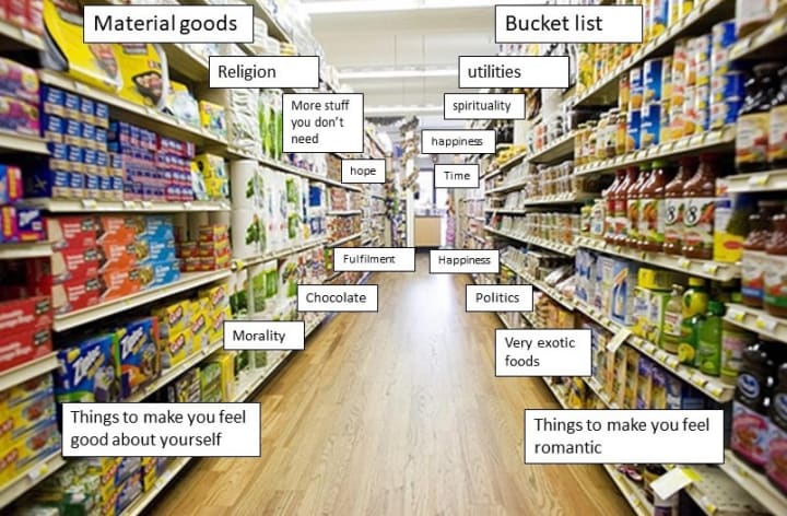 The pinnacle of "status" is luxury; what you own, what you have, what you have experienced, says who you are. We use this to calibrate where we are in our lives. Economies are built around the need for growth and are predicated on conspicuous consumer choice, "freedom of choice".