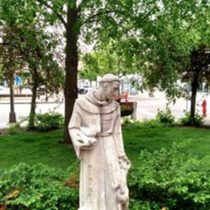 A few weeks ago I just happened to walk around the block from my church, on my way to nowhere in particular, and lo and behold! A little grove of trees~with my friend St. Francis looking after the little birds that hopped around at his feet.
