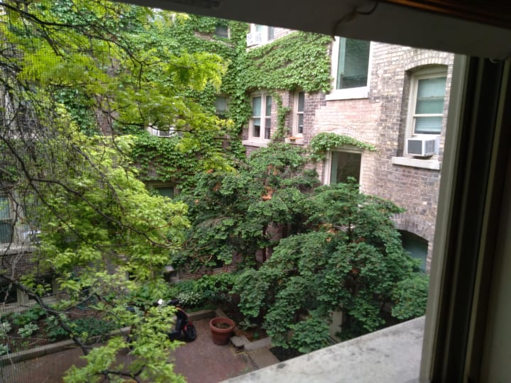 Then, finally reaching my little home, I look out over the lovely courtyard below, and take a picture to capture the scene outside my window that welcomes me home.