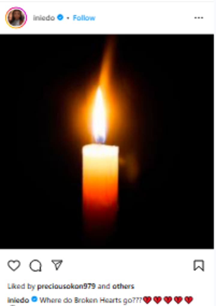 Beloved Nollywood actress Ini Edo caused quite a stir and a fright to many of her fans, friends and loved ones about a week ago when she made a cryptic post showcasing a burning candle often used as the symbol to represent the passing of someone. Ini Edo posted the picture of the burning candle on her social media along with the caption "Where do Broken Hearts go???💔💔💔💔💔 😇" which features a number of heartbroken emojis and an emoji with a halo.
