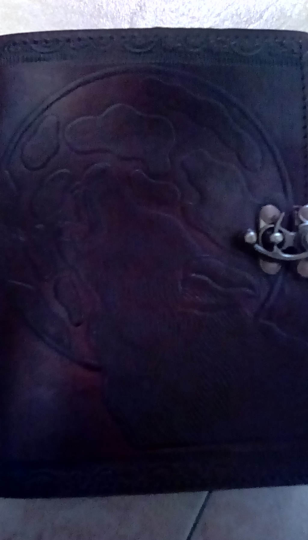 It’s made of a softened black leather, that has the feel of velvety softness to it when you run your fingers over it. The pages inside are softened in an off white color, almost looks and feels like an old piece of paper would feel like if you have ever felt an antique type of paper. It’s a little thicker and has a stiffness to it but soft to the touch. The books bound together with a sort of twine rope. The twine connects each soft white page together which creates an X design on the outside binding of the book that runs along the back of the outside binding. There are two large X’s made of twine designed on the outside binder of my little black book, while on the inside you can only see two pieces of the twine that run straight down the middle as you turn each page. On the front of my little black book is an image of a wolf that has been pressed into the fine leather, howling at the moon. The book is held shut with a latch that is made of a yellow colored metal. It appears tarnished. and that looks like a tooth which pushes through a metal hole on the books cover.