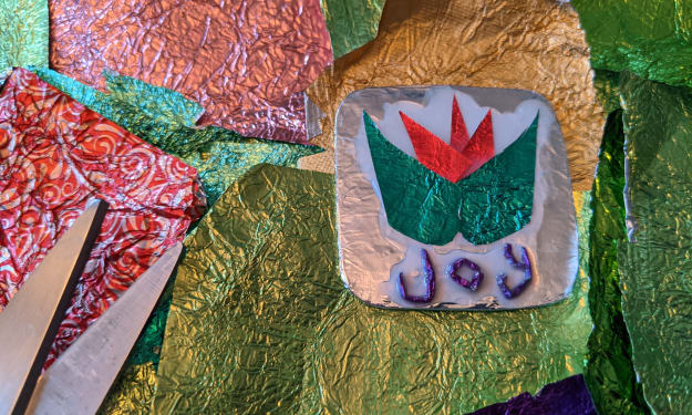 The inspiration to start making foil artwork began with my older sister's piano students who would come to my home in the evenings. After their lessons, they would always get to pick out a chocolate candy from the big jar my sister kept next to the piano. I loved the bright, metallic shine of the foil wrappers and whenever I pilfered her candy jar, I would unwrap each piece ever so slowly and carefully and smooth out the foil in a perfect square. I even bribed the piano students to save their wrappers for me and taught them how to use a little patience to unwrap their candy without tearing the colored foil.
