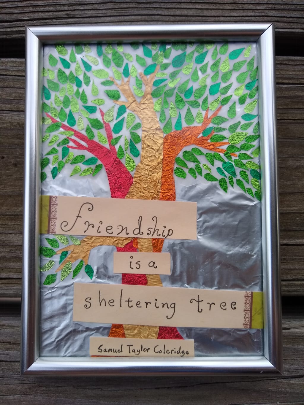 My favorite art project I have made from candy wrapper foils, is called "Friendship Tree." It started with a twisted, intertwining trunk and branches. But the twists didn't come out quite right. It would take a stretch of the imagination to see the tree trunk as beautiful as I wanted it to be. So, I googled every quote I could find about trees and found one just the right length to cover every awkward join into something meaningful. That part actually went well. But then came the tedious monotony of cutting and glueing leaf after tiny leaf to fill out the branches. I almost gave up and added it to my box of unfinished art projects that maybe I'll finish one day. But this project mattered to me, and I kept at it until every leaf was finished. Here come two more lessons. Friendship isn't always easy. Sometimes it goes badly and there are rough spots. Or sometimes it gets really boring. But there's always a way to turn the rough spots into something meaningful. And it's always worth it to commit to friendship even when it's not exciting.