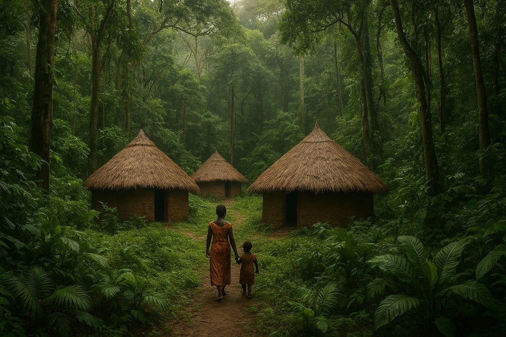 Life in these villages is simple yet deeply rooted in community. Children play barefoot on the earth, learning to respect the forest as their ancestors did. Women, like the one holding her child’s hand in the image, balance multiple roles: gatherers of food, caretakers of the family, and keepers of cultural knowledge. Men often hunt or farm, ensuring the village’s survival. Together, the community thrives, not in opposition to the forest but as part of it.