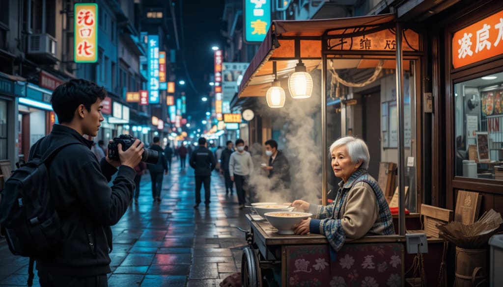 One chilly evening, as Minh wandered through an old district, his camera slung over his shoulder, he noticed an elderly woman selling food on a quiet street corner. Her silver hair reflected the glow of flickering streetlights, and her tired hands carefully ladled steaming bowls of congee to weary workers.