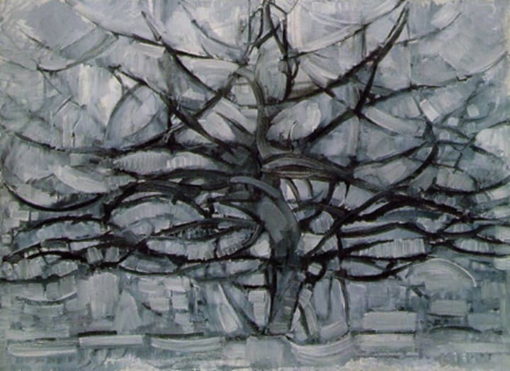 Where Rothko was attempting to move the observer, Mondrian was simplifying forms through the use of straight lines and blocks of color (primary colors). Mondrian is best known for his abstract paintings made from squares and rectangles. However, he started off painting trees. While examining the visual aspects of his abstract paintings we might still be able to see the tree for the forest of lines and squares.