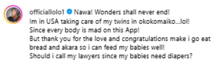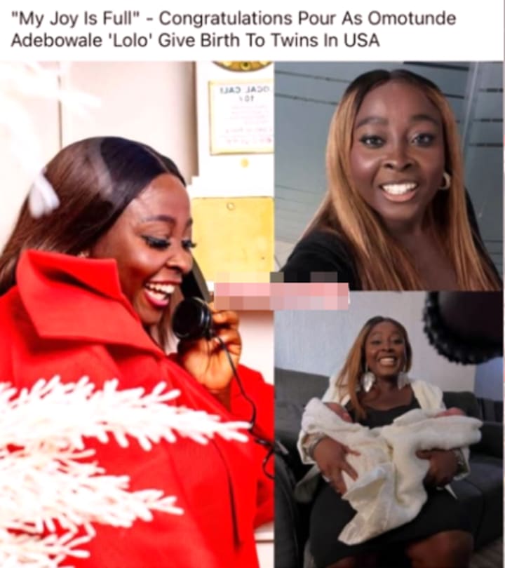 The whole ordeal happened after speculation arose from a misleading Facebook post featuring Lolo holding twins, accompanied by the caption: "My Joy is Full - Congratulations Pour as Omotunde Adebowale 'Lolo' Give Birth to Twins in USA."
