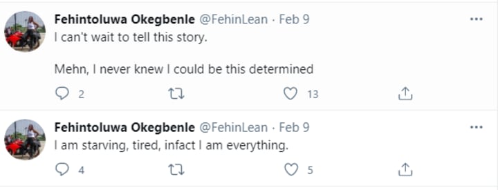 I can't wait to tell this story. Mehn, I never knew I could be this determined. I am starving, tired, infact I am everything.