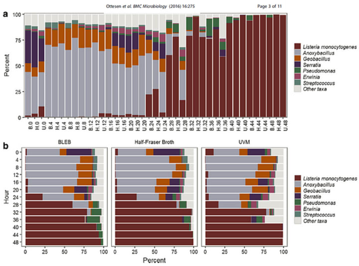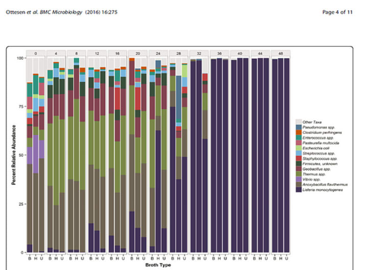 This is a very important finding because it confirms what many, including myself, have long believed, that any diagnostic method for L. mono that uses an enrichment of <24h needs to be looked at skeptically and pushed extra hard in validation. The burden of proof is on the test kit/enrichment media manufacturer to show that their particular media/test works better than these three most common and widely used ones. Another interesting finding related to the relative abundance and makeup of the other members of the microbial community in these enrichments. Unsurprisingly there was a predominance of gram positives. All of the media tested are selective for L. mono (a gram positive) and therefore contain agents that selectively suppress the growth of gram negatives. They cannot have anti-gram positive agents included as they would prevent the growth of the Listeria as much as any other gram positives present and to date there are no anti gram positive selective agents known (that I am aware of) that actively suppress all or some or most gram positives except Listeria.