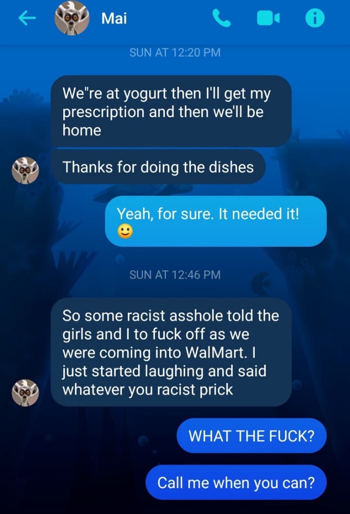 Mai played it cool when she got home. She told me the story of what went down. She was quite unbothered by it and very nonchalantly explained what happened. I quietly listened but was seething underneath my calm exterior while hearing the disgusting details.