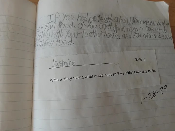 I really enjoyed this Jasmine! I come from a family of retired Dentists so the prompt made me laugh! But there is so much more here. A very wise and innovative teacher - fostering the inquiring mind, creativity. Creative writing yes - but also journaling. Finally, rare treasures you have shared. Photos from your journal. Thank you for writing - a great read. Pauline 🌸