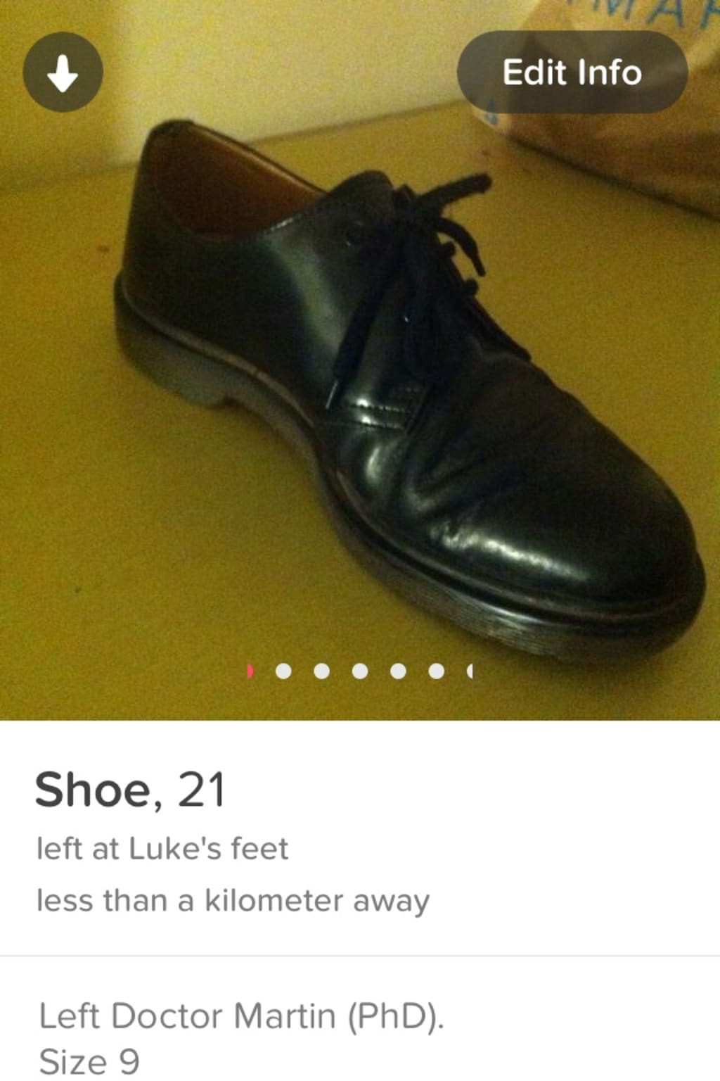 November 2016 saw the American people decide their 45th President. Across the atlantic, a heartbroken, semi-functional 21-year-old drama student with the emotional intelligence of a swan fighting a bin made an equally profound decision. In the third year of university—when I wasn’t stealing condiments from house parties, drinking £3 bottles of merlot five times a week, or showing my testicular surgical scar to my housemates—I was making healthy and mature decisions about my adult life. One of these healthy and mature decisions involved making a Tinder account for my shoe. It seemed like a funny idea at the time, and it would mask the pain. "Oh, Luke?" I imagined someone saying to someone else. "He's the guy who made a Tinder account for his shoe!" "That guy sounds really fun and cool. I would like to meet him. Maybe he'll have some advice about never being hurt." This was a fool-proof plan towards a healthy and mature lifestyle, and no one could prove otherwise.