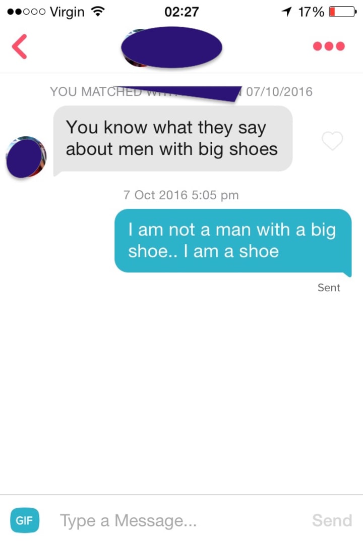To my amazement though, almost every single person the Shoe swiped right for was a match. It wasn't long until the messages came flooding through as well, in a tsunami of enthusiastic confusion. I'd opened the floodgates to a sea of bizarre propositions and shoe puns; "I wanna tie the knot with you.", "Can I put myself inside you?", "Hey, left shoe. I'm your Mr. Right", "Can you tie me up?" etc.