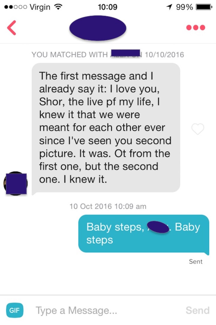 I wasn't purely conducting a social experiment, though. I was fucking with people as well. Using the Shoe's Tinder gave me a liberating mask that allowed me to chit-chat completely care-free. My previous experience on Tinder was limited to the same repetitive conversations. Online courtship had lulled me into a mindless, muscle memory exercise in small talk. Fueling this was my neurosis about what strangers thought about me.