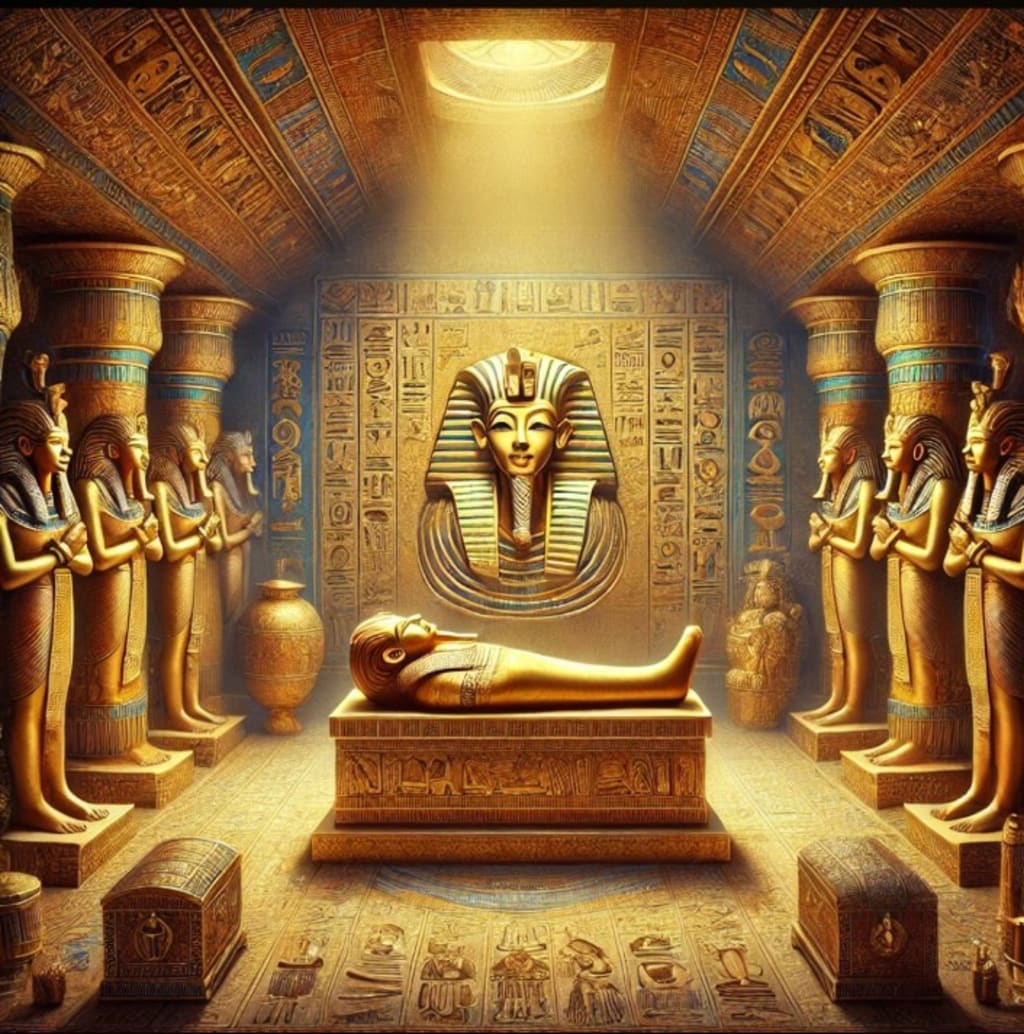 A stunning digital artwork depicting a serene ancient Egyptian burial chamber inspired by Tutankhamun’s tomb. The golden sarcophagus sits at the center of a richly decorated room, surrounded by hieroglyphics and colorful frescoes. The space glows with warm golden light, showcasing ceremonial artifacts such as vases, chests, and intricate treasures. This artwork captures the mystery and splendor of ancient Egyptian heritage, offering a timeless and enchanting view of its burial traditions.