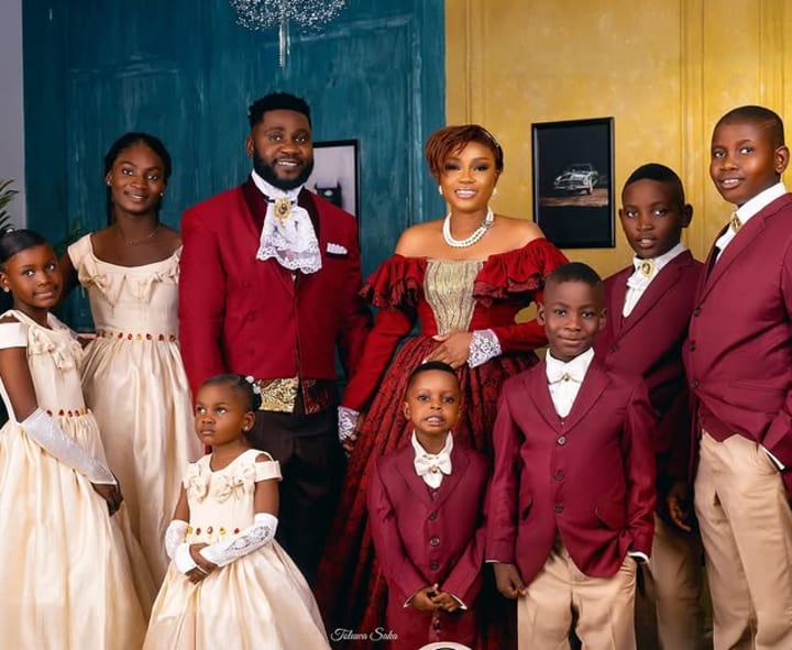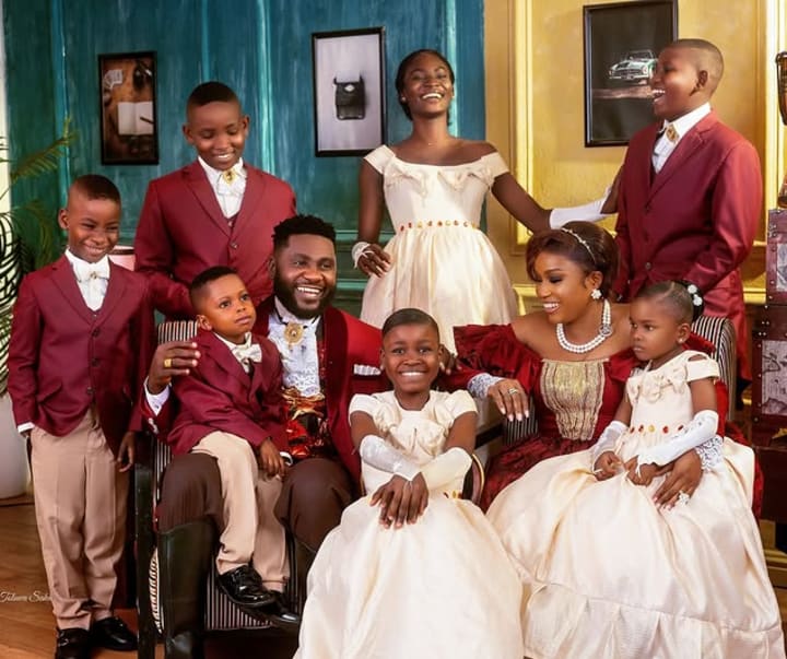 Nollywood actor Jide Awobona popularly known for his roles in productions like Jenifa's Diary, Omo Ghetto: The Saga, Lisabi, and more is making the jaws of fans all over the world drop to the floor as he reveals his family portrait showcasing his wife and SEVEN children.