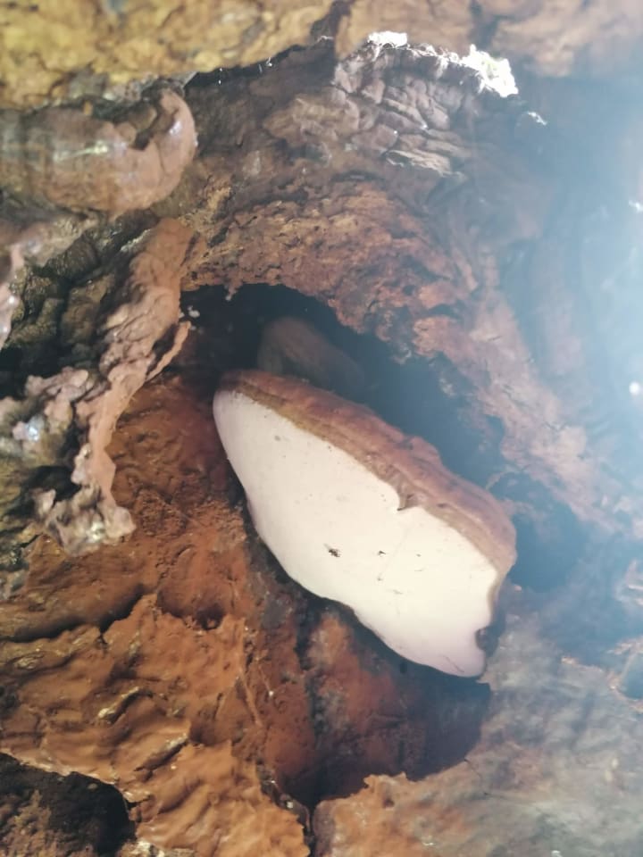 I’d walk through rows of cherry trees, and the scent would be divine, naturally guided by the tones of brilliant red. Pockets of colours would embrace you as you walk. Having a magnetic drive towards the violets would charge my inner spirit with such joie de vivre. Exuberant in every step, I would embrace all the living by exploring and learning what it offers. Looking inside a hollowed-out tree, I found an artist’s bracket, a type of fungus that when you touch the white underneath it goes brown; natures own canvas. I managed to find one that had broken off, undamaged. I decided to find somewhere to sit whilst I thought about what I wanted to draw on it.