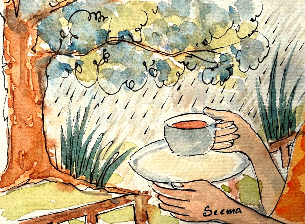I am 42, a mother of two kids under six, and nowadays nostalgia often hits me. I try to quench it with my art. Here, I am depicting evening time and hospitality in the village I grew up in, India.