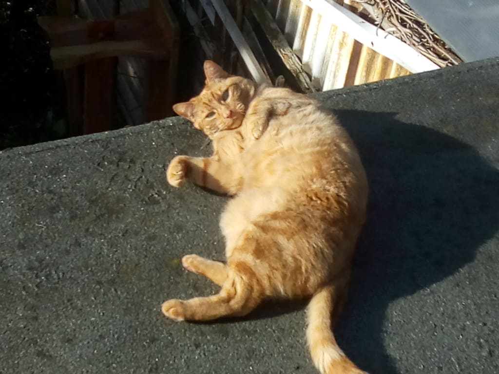 A soft noise from above her made her look up into the eyes of a massive ginger cat.