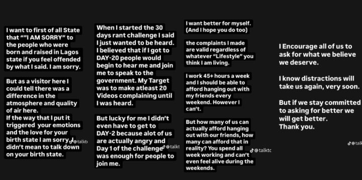 When I started the 30 days rant challenge I said I just wanted to be heard. I believed that if I got to DAY-20 people would begin to hear me and join me to speak to the government. My Target was to make at least 20 videos complaining until I was heard. But lucky for me I didn't even have to get to DAY-2 because a lot of us are actually angry and Day 1 of the challenge was enough for people to join me.