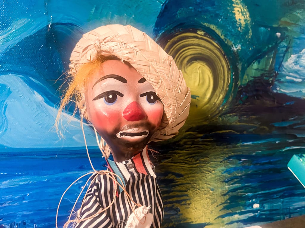 This one is a clown. Well, sort of. The curly hair and the circus clothes are definitely popping out at me. But there’s something else I can’t quite see yet. He’s got a voice, this one. I think he’s a singer. Maybe I’ll make him a little mic. They are all extensions of me. My characters. I do love to sing.