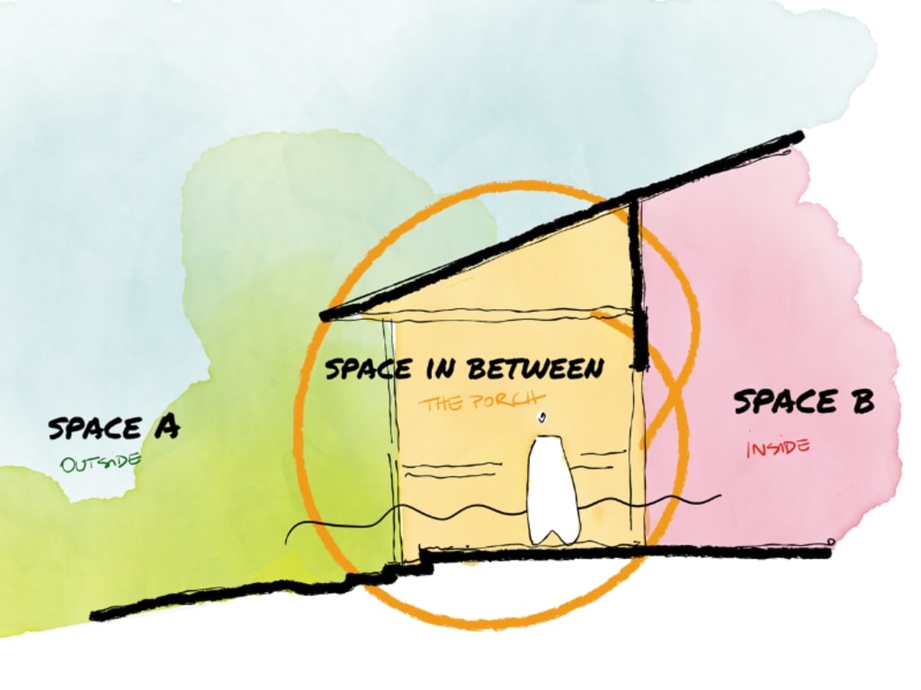 “The staircase is a transitional space between the downstairs and the upstairs. The hallway is an transitional space between the outside and the rooms. The porch is a transitional space between the house and nature. Actually both the hallway and the porch are the same thing but one is more on the outside of the house and the other is more on the inside of the house. I’ll let you guess which.