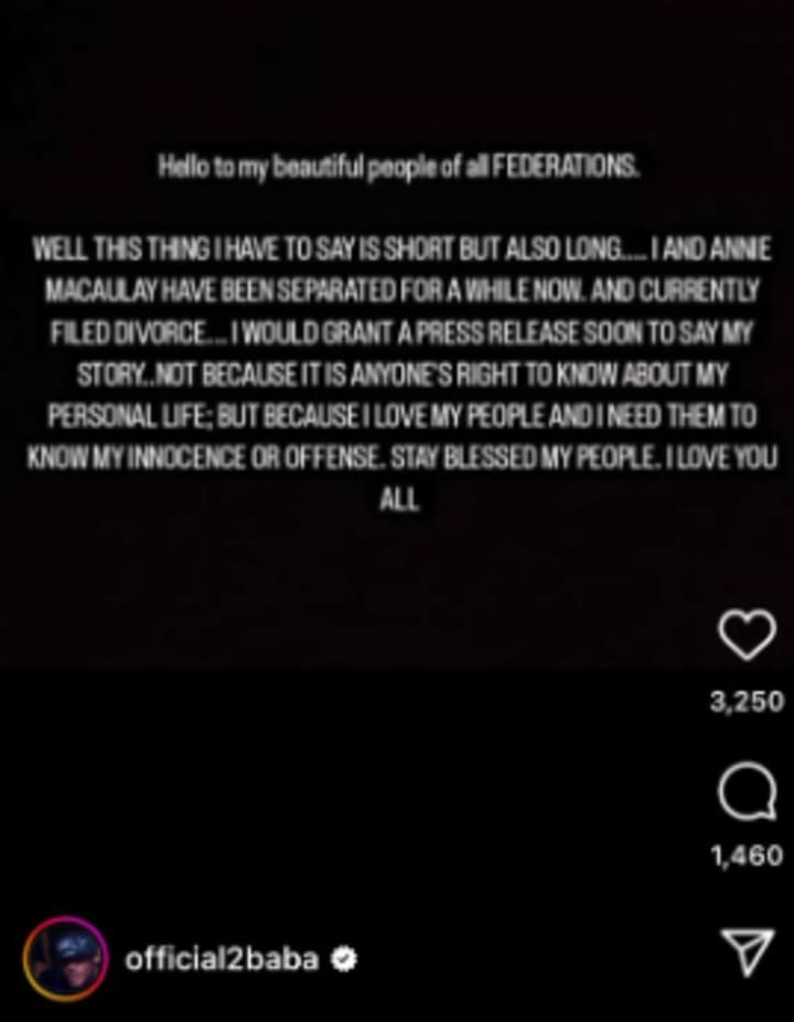 Well this thing I have to say is short but also long. I and Annie Macaulay have been separated for a while now. And currently filed divorce. I would grant a press release soon to say my story. Not because it is anyone's right to know about my personal life; but because I love my people and need them to know my innocence or offense. Stay blessed my people. I love you all.