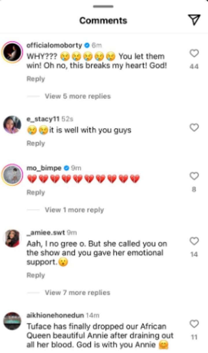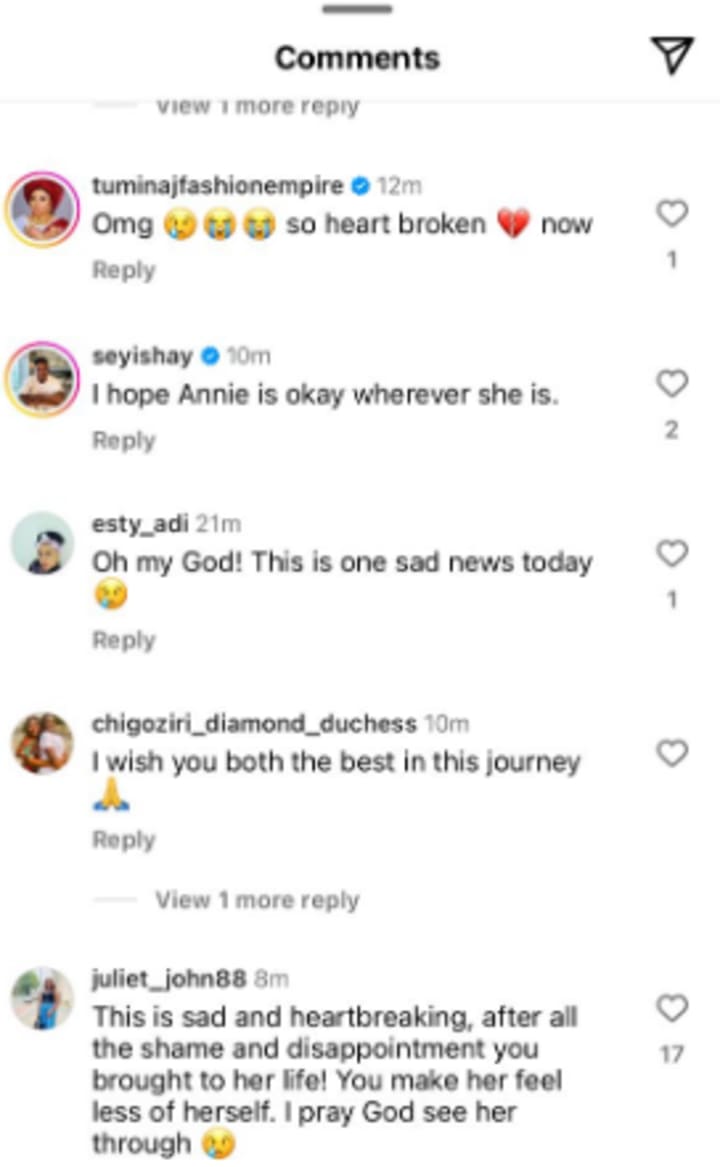 And then the fans too are very upset. One fan wrote saying "This is sad and heartbreaking, after all the shame and disappointment you brought to her life! You make her feel less of herself. I pray God see her through" while another said "I hope Annie is okay wherever she is" amidst more comments.