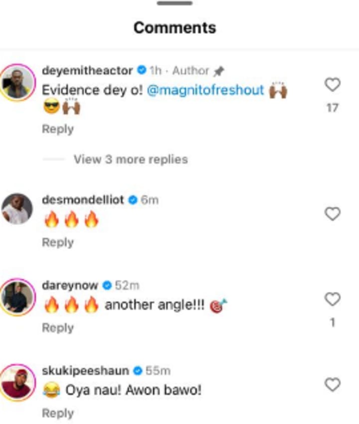 The video quickly sparked reactions from fans and colleagues alike. Actor Desmond Elliott reacted with three fire emojis (🔥🔥🔥), signaling his approval of Deyemi’s unexpected musical venture. Singer and producer Darey Art Alade also chimed in with fire emojis, adding, “🔥🔥🔥 another angle,” hinting at Deyemi’s versatility. Media personality Peeshaun joined the conversation too saying, “Oya nau! Awon bawo!”