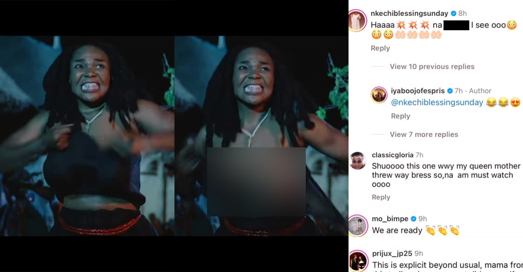 After speaking about the movie, Iyabo Ojo also posted a trailer for the movie and the final shot in the trailer is getting people talking. In the surprising moment, Iyabo as the character of Labake tears open her shirt revealing breasts and people online were so surprised by it. Actress Nkechi Blessing said "Haaa na breast I see ooo" and that is just one of many similar comments. Here is a screenshot of the surprising moment, and the Labake Olododo trailer.