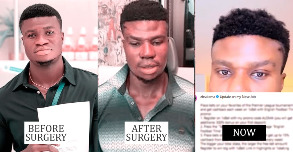Nigerian content creator and business man Zicsaloma has been the topic of conversation ever since announcing that he was undergoing a rhinoplasty aka plastic surgery on the nose. Earlier today, pictures of a swollen Zicsaloma fresh after the surgery started circulating, and now, the actor is here with new images and a new video to show off his face now after the swollen has reduced slightly. Speaking on the whole thing Zicsaloma said:
