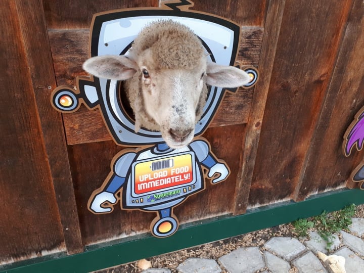 We fed the sheep as they popped their heads through custom-made holes in their pen, cute little faces surrounded by images of robots, superheroes, lions, kangaroos, and even a washing machine. Slogans like “Super hungry,” “Beware of sheep,” and “Upload food immediately!” paired with the pictures adorning the wooden structure. Having bought some sheep pellets at the entrance, we giggled as eager lips grabbed their fill, munching down on the treats.