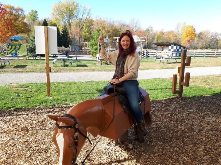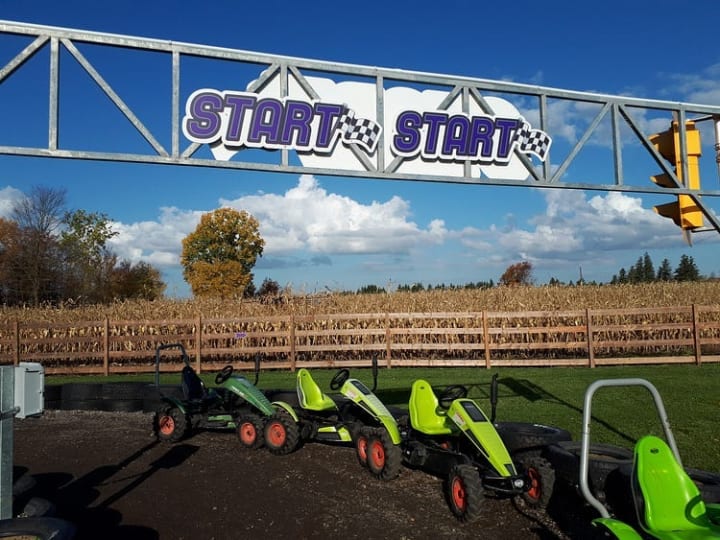 Still giddy from our adrenaline-fuelled racetrack dash, we took to calmer pursuits on a couple of fake horses as I attempted my best rodeo stance decked out in my cowboy boots. After a foray into the corn maze, we sat enjoying the crisp autumn day as my friend’s three-year-old daughter scaled and climbed the colourful buildings in the playground, calling to the new friends she made along the way.