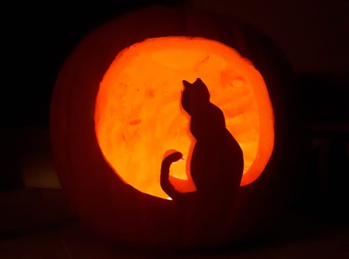 As on my first visit, we ended our time by taking a tractor to the pumpkin patch to select the ones that we wanted to take home and carve. Two years prior, I had carved an homage to my kitty who had died earlier in the year, but this time I opted for a more traditional carving.
